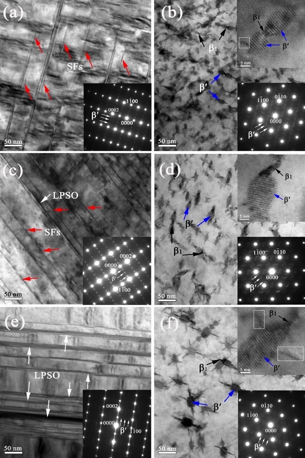 重點研究了基面析出相-LPSO相、層錯與柱面析出相-β′相的相互作用關(guān)系,結(jié)果如圖3所示。獲得細(xì)小且彌散分布的β′相是高強韌鎂合金的主