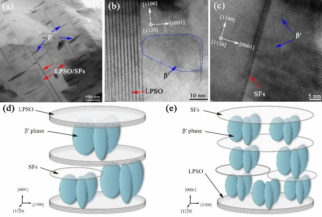 圖3 LPSO相、層錯以及β′相的分布及形貌(a, b, c)以及三種強化相間的強化模型(d, e)