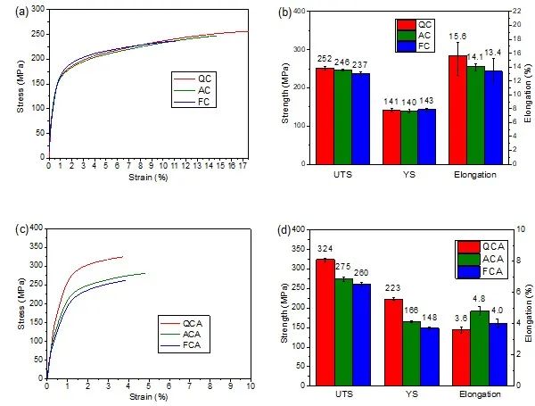 圖4 不同冷卻速率下固溶態(tài)與時效態(tài)合金室溫力學(xué)性能,(a, b)固溶態(tài)合金,(c, d)時效態(tài)合金