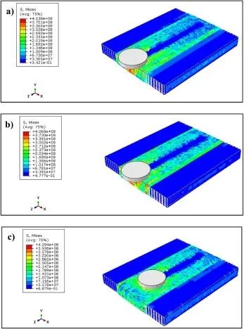 圖1 在150 mm/min的恒定焊接速度和不同旋轉(zhuǎn)速度下焊接后試樣中的殘余應(yīng)力場(chǎng)分布(未預(yù)熱):(a)600 rpm,(b)900 rpm和(c)1200 rpm