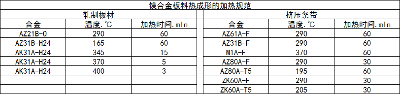 鎂合金板條可在高溫下一次拉伸成形相當(dāng)復(fù)雜的工件,不需要退火,因此,工序少、成形時(shí)間短,所用工模具也簡(jiǎn)單,工件回彈小,成形后也不需要整形,工件尺寸偏差比冷成形的小得多,力學(xué)性能也不會(huì)下降。鎂合金板料熱成形加熱規(guī)范見(jiàn)下表。