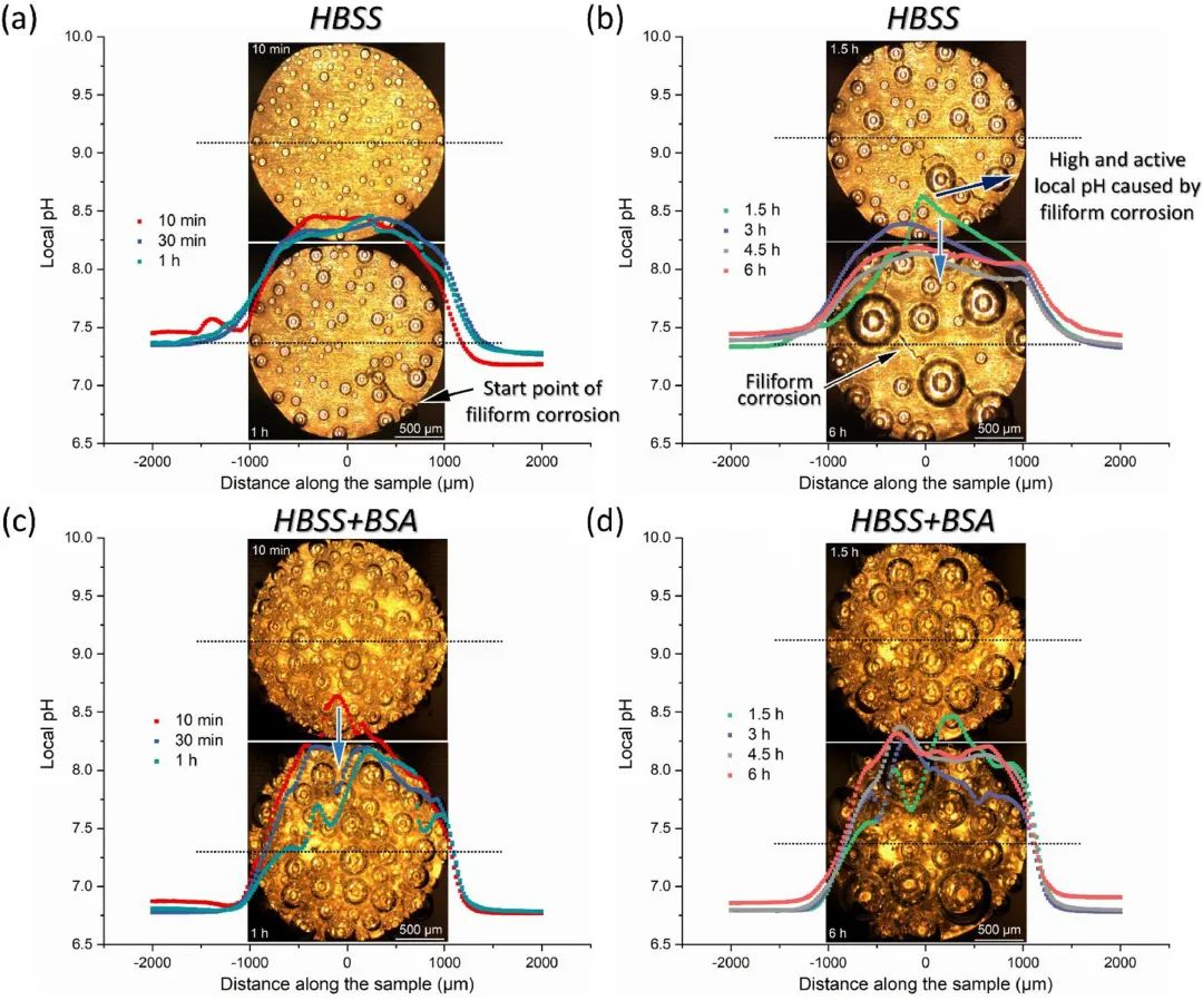 圖2 浸入(a, b) HBSS中的CP Mg表面50 μm處的局部pH測(cè)量(線掃描),(c, d) 浸入過程中的HBSS+BSA中的CP Mg表面50 μm處的局部 pH測(cè)量(線掃描)。所有測(cè)量均在流體動(dòng)力學(xué)條件下進(jìn)行,流速為1.0 mL/min。光學(xué)顯微照片顯示了測(cè)試過程中兩個(gè)樣品的視覺外觀
