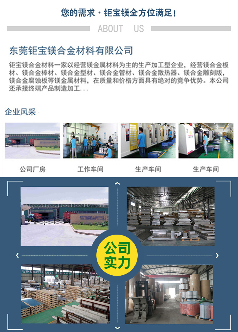東莞市鉅寶鎂合金材料有限公司是一家專業(yè)從事鎂合金系列產(chǎn)品的研發(fā)、生產(chǎn)、銷售為一體的企業(yè),多年來(lái),在同行業(yè)和消費(fèi)者的心中了贏得非常值得信賴的口碑,本司主要產(chǎn)品有:鎂合金板、鎂合金管、鎂合金棒、鎂合金型材、鎂豆、鎂絲、蝕刻板、雕刻板、及鎂合金機(jī)加工產(chǎn)品,主要應(yīng)用于:航天、軍工、軌道、交通、新能源汽車、智能制造、3C等各種領(lǐng)域,我司的產(chǎn)品暢銷美、歐、日、韓等各國(guó),另外我司還通過(guò)了ISO9001:2015國(guó)際質(zhì)量管理體系認(rèn)證,擁有規(guī)范和完善的質(zhì)量體系,公司秉承“誠(chéng)信、專業(yè)、共贏”的經(jīng)營(yíng)理念,堅(jiān)持用戶至上,以優(yōu)質(zhì)的服務(wù)來(lái)服務(wù)好每一位客戶,堅(jiān)持技術(shù)上不斷創(chuàng)新、不斷超越,用我們的優(yōu)質(zhì)服務(wù)以及專業(yè)技術(shù)為客戶提供產(chǎn)品的后續(xù)表面處理及售后服務(wù)。
